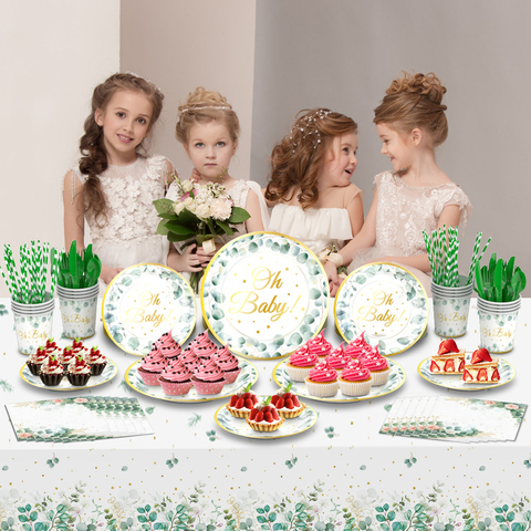 Platos y servilletas de papel en relieve dorado con estampado personalizado, suministros para fiestas, vasos y platos desechables de hojas de eucalipto para Baby Showers