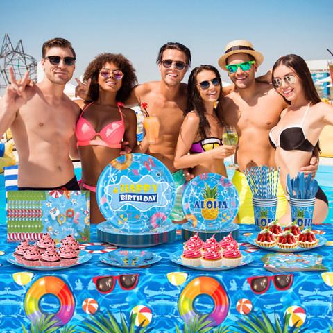 Suministros de papel reutilizables ecológicos modernos para fiestas de Cumpleaños de Niños, decoraciones de playa para piscina, platos y tazas para