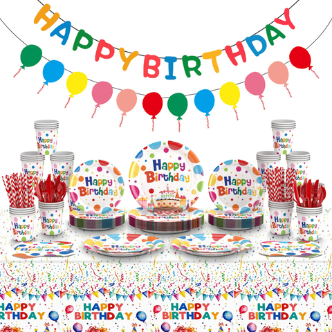 Juego de platos de papel para fiesta de cumpleaños de lunares de siete colores, juego de vajilla para fiesta de cumpleaños desechable para niños